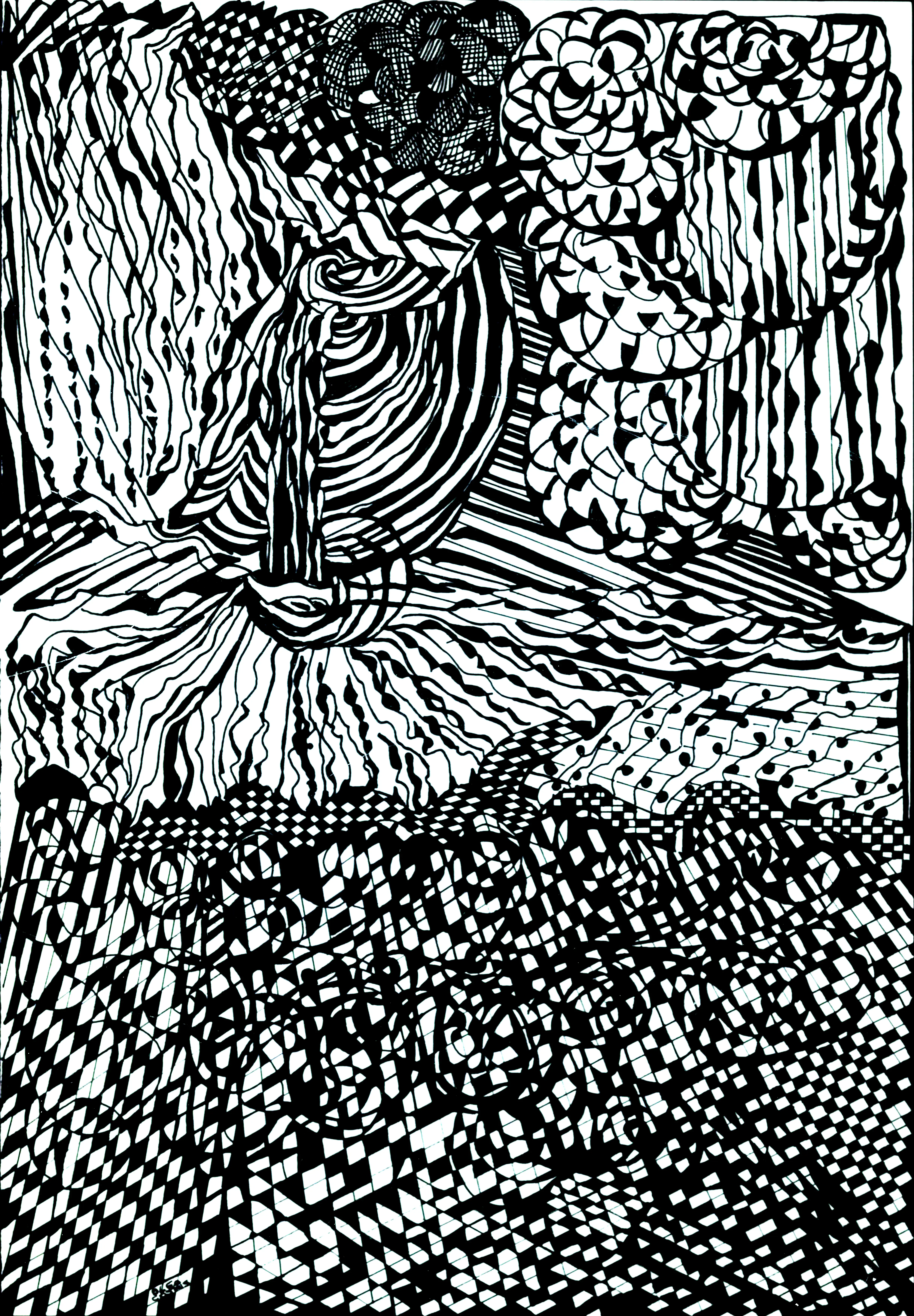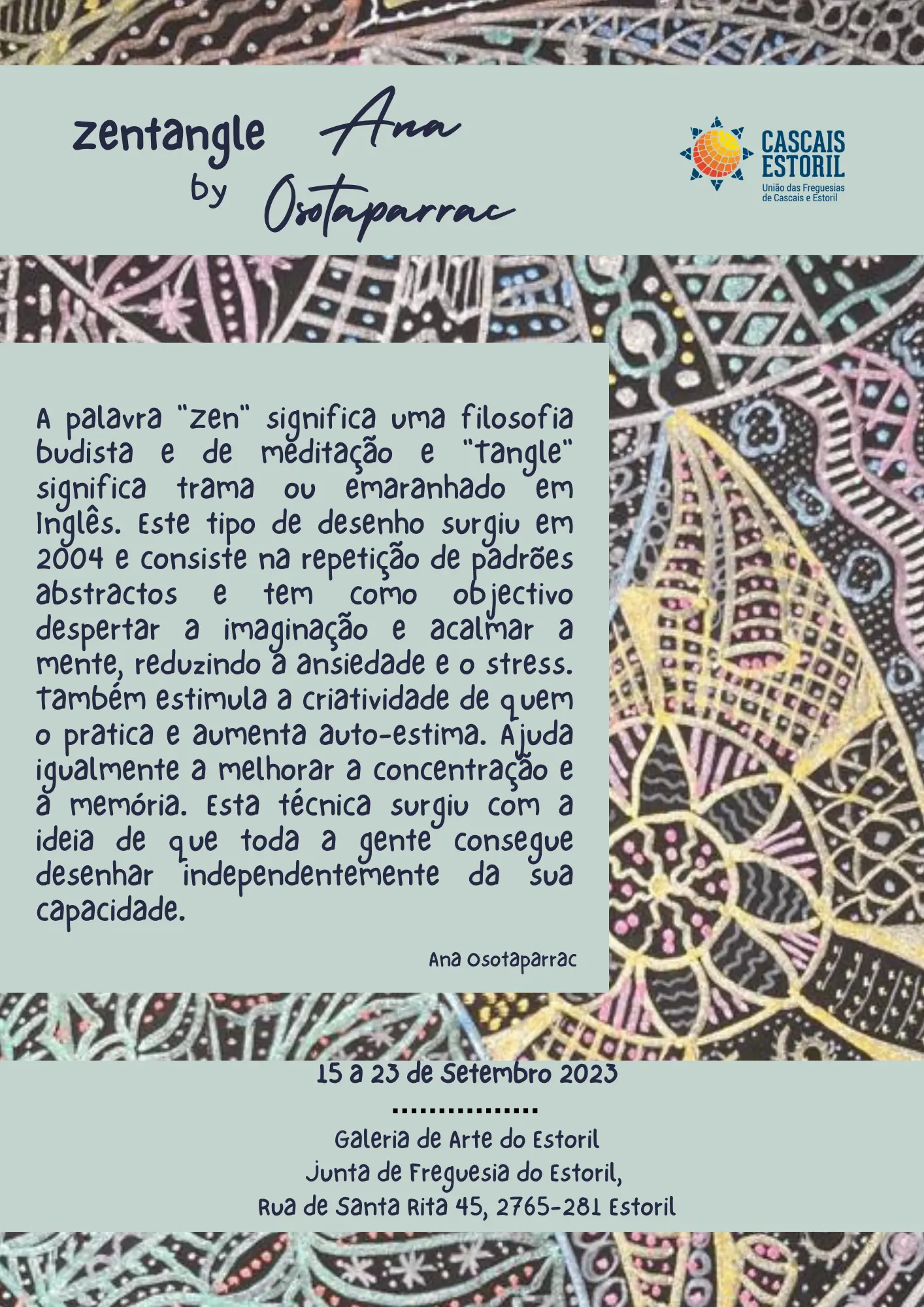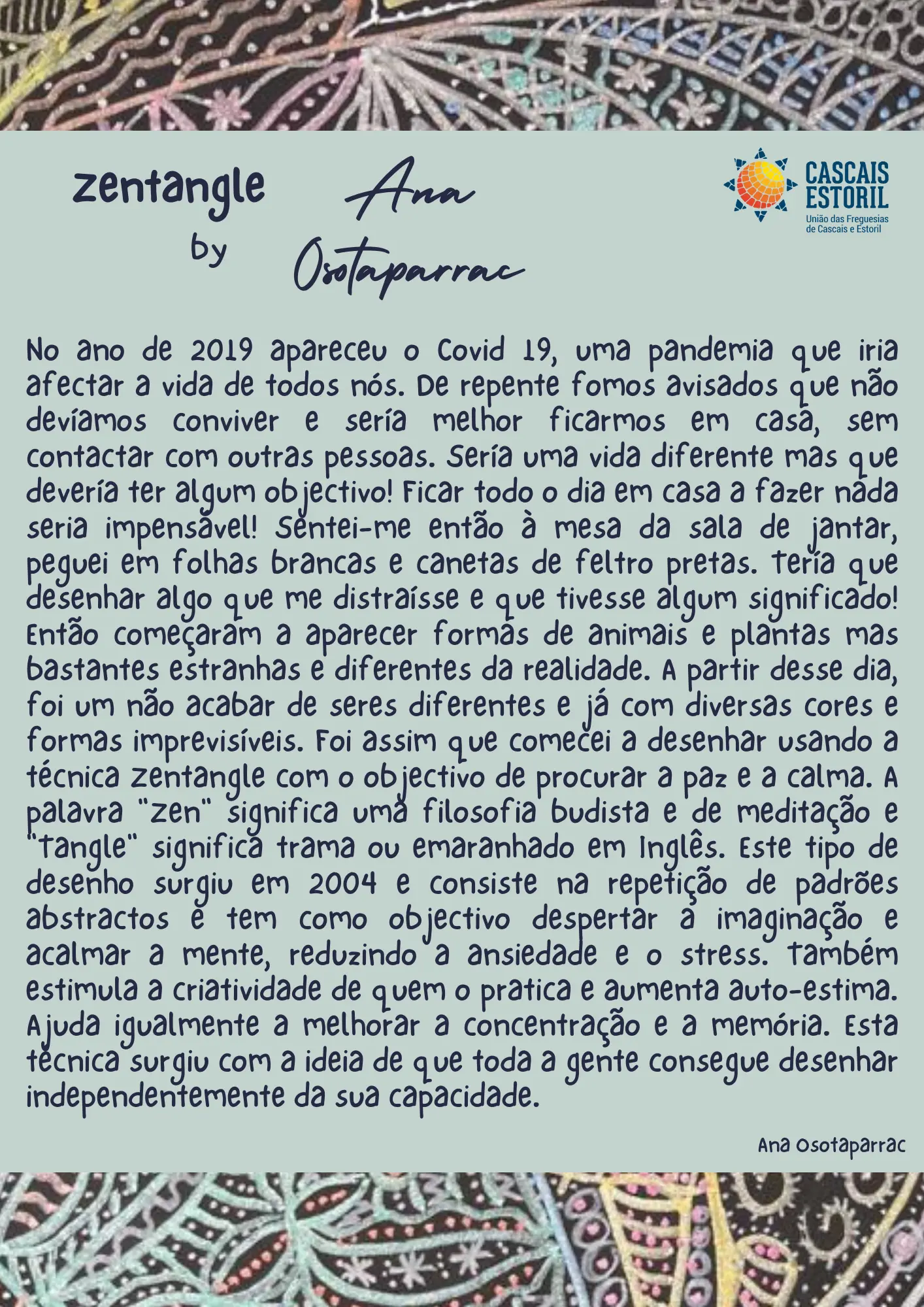 "No ano de 2019 apareceu o Covid 19, uma pandemia que iria afetar a vida de todos nós. De repente fomos avisados que não devíamos conviver e seria melhor ficarmos em casa, sem contatar com outras pessoas. Seria uma vida diferente, mas que deveria ter algum objetivo! Ficar todo o dia em casa a fazer nada seria impensável! Sentei-me então à mesa da sala de jantar, peguei em folhas brancas e canetas de feltro pretas. Teria de desenhar algo que me distraísse e que tivesse algum significado! Então começaram a aparecer formas de animais e plantas, mas bastantes estranhas e diferentes da realidade. A partir desse dia, foi um não acabar de seres diferentes e já com diversas cores e formas imprevisíveis. Foi assim que comecei a desenhar usando a técnica Zentangle com o objetivo de procurar a paz e a calma. A palavra "Zen" significa uma filosofia budista e de meditação e "Tangle" significa trama ou emaranhado em inglês. Este tipo de desenho surgiu em 2004 e consiste na repetição de padrões abstratos e tem como objetivo despertar a imaginação e acalmar a mente, reduzindo a ansiedade e o stress. Também estimula a criatividade de quem o pratica e aumenta autoestima. Ajuda igualmente a melhorar a concentração e a memória. Esta técnica surgiu com a ideia de que toda a gente consegue desenhar independentemente da sua capacidade." Ana Carrapatoso